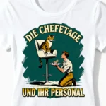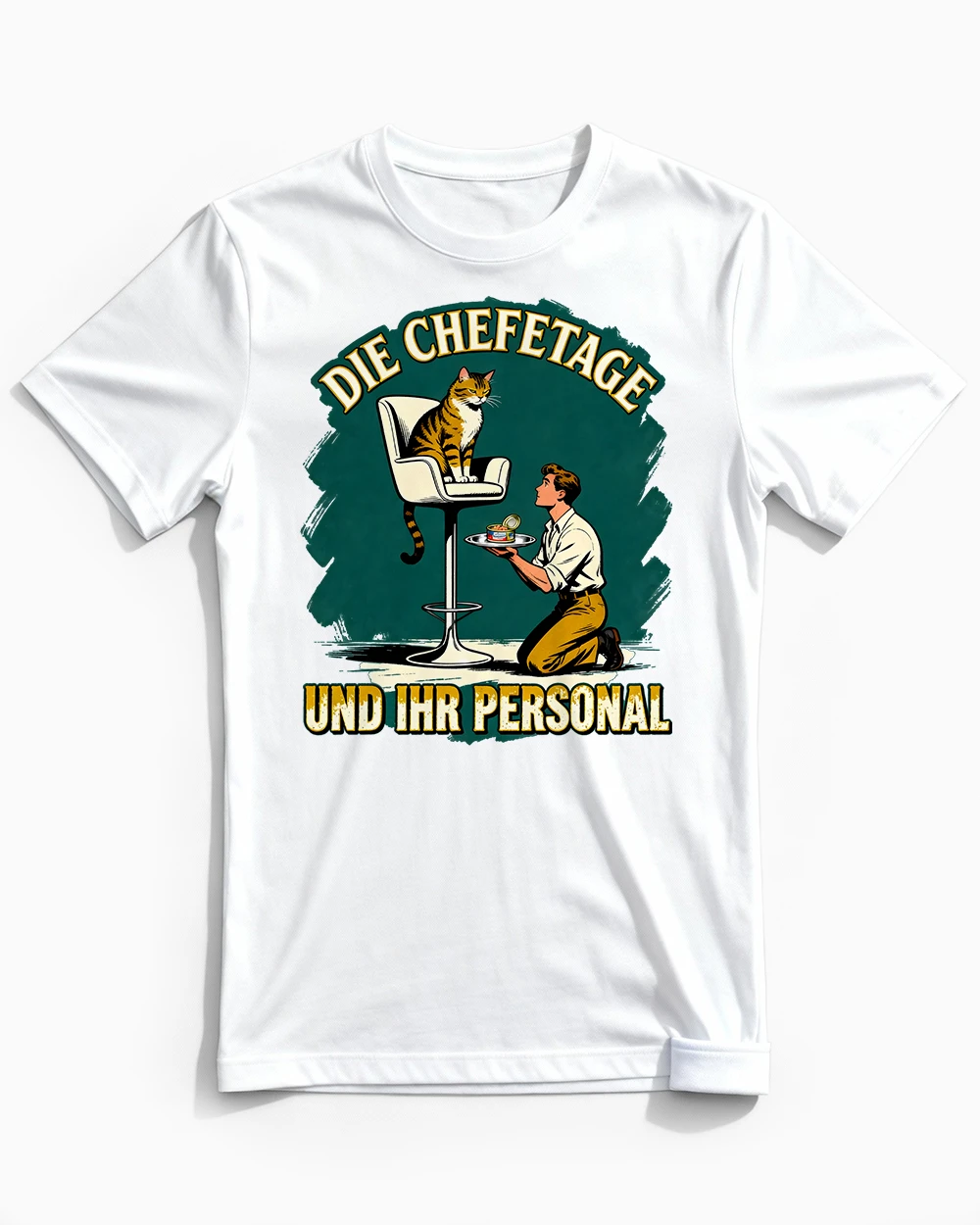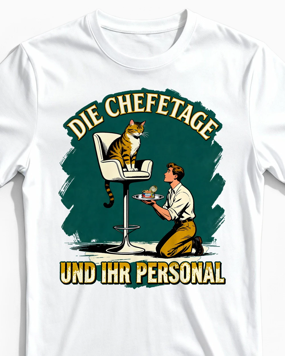 Die Chefetage | Lustiges Katzen-Herrenshirt für qualifiziertes Dosenöffner-PersonalJeder Katzenbesitzer kennt die Wahrheit: Man besitzt keine Katze, man wird von ihr geduldet! Unser „Die Chefetage und ihr Personal“ Herrenshirt bringt die Machtverhältnisse in deutschen Wohnzimmern humorvoll auf den Punkt. Das Motiv im charmanten Retro-Illustrationsstil zeigt die „Chefetage“ in Form einer majestätischen Katze, die würdevoll auf einem hohen Designerstuhl thront. Davor kniet ihr treues „Personal“ – ein Mann, der voller Hingabe die nächste Dose Gourmet-Futter auf einem Silbertablett serviert. Ein Bild, das mehr sagt als tausend Worte über die bedingungslose Liebe (und Unterwerfung) von Katzenfans.
